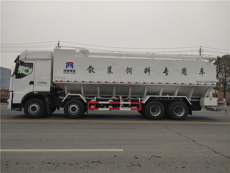 散裝飼料車,又名散裝飼料運(yùn)輸車,飼料運(yùn)輸車。結(jié)構(gòu)簡單、性能可靠、輸送量大、操控方便、機(jī)動性強(qiáng)、對物料無污染等特點,廣泛應(yīng)用于各大中小型養(yǎng)殖企業(yè)的飼料的運(yùn)輸。散裝飼料車的飼料罐架設(shè)在卡車的底盤上,罐頂開有進(jìn)料口.頂部的一根螺旋輸送卸料管(俗稱卸料絞龍)則可自由回轉(zhuǎn)和抬升,抬升的仰角可達(dá)60度。運(yùn)輸時,頂部的螺旋管平臥在罐頂;卸料時則抬起,使管端的出料口與畜禽飼養(yǎng)場貯料罐頂部的進(jìn)料門相接,駕駛室內(nèi)裝有操縱裝置(操縱裝置也可裝置在罐體尾部),卸料時通過車底的動力輸出軸和減速器來驅(qū)動螺旋,以完成卸料。