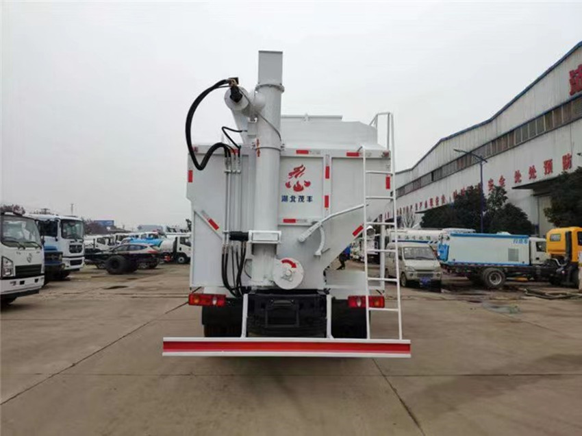 散裝飼料運(yùn)輸車,散裝飼料車的飼料罐架設(shè)在卡車的底盤上,罐頂開有進(jìn)料口.頂部的一根螺旋輸送卸料管(俗稱卸料絞龍)則可自由回轉(zhuǎn)和抬升,抬升的仰角可達(dá)60度。運(yùn)輸時(shí),頂部的螺旋管平臥在罐頂;卸料時(shí)則抬起,使管端的出料口與畜禽飼養(yǎng)場(chǎng)貯料罐頂部的進(jìn)料門相接,駕駛室內(nèi)裝有操縱裝置(操縱裝置也可裝置在罐體尾部),卸料時(shí)通過車底的動(dòng)力輸出軸和減速器來驅(qū)動(dòng)螺旋,以完成卸料。