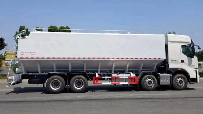 散裝飼料運輸車,散裝飼料車的飼料罐架設在卡車的底盤上,罐頂開有進料口.頂部的一根螺旋輸送卸料管(俗稱卸料絞龍)則可自由回轉和抬升,抬升的仰角可達60度。運輸時,頂部的螺旋管平臥在罐頂;卸料時則抬起,使管端的出料口與畜禽飼養(yǎng)場貯料罐頂部的進料門相接,駕駛室內裝有操縱裝置(操縱裝置也可裝置在罐體尾部),卸料時通過車底的動力輸出軸和減速器來驅動螺旋,以完成卸料。